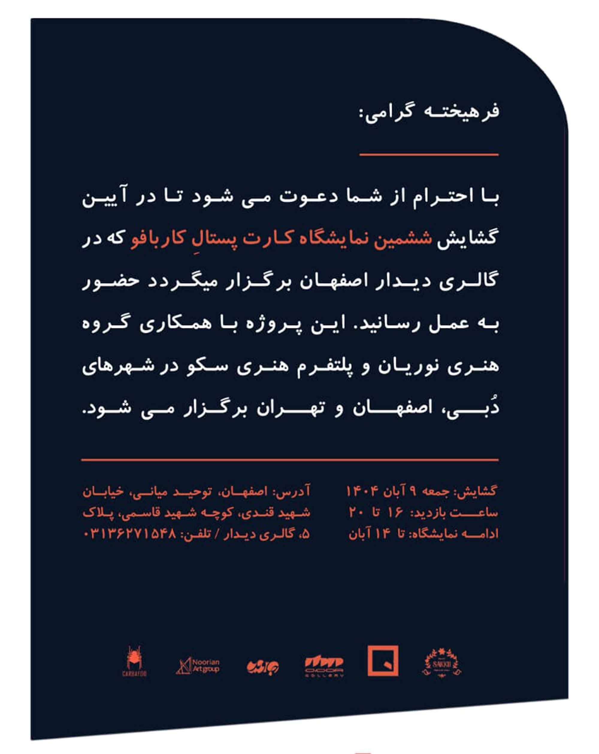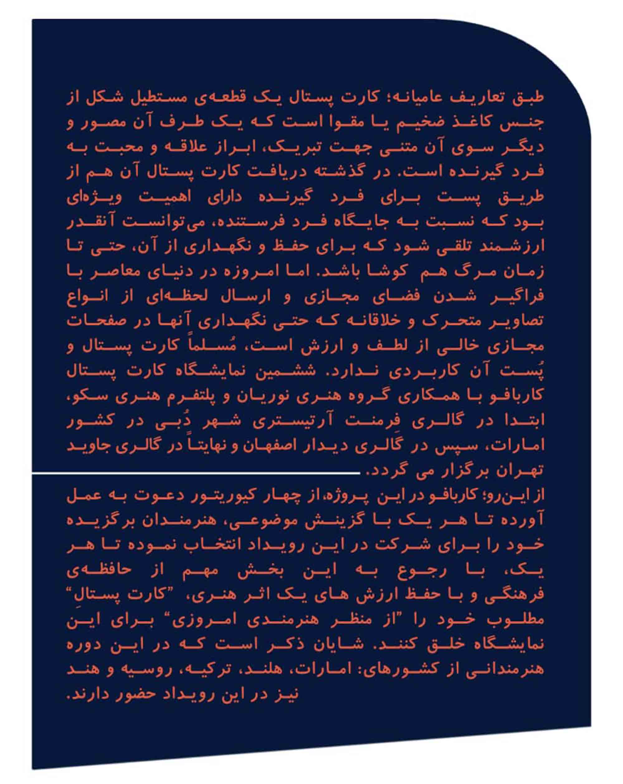 طبق تعاریف عامیانه کارت پستال یک قطعه ی مستطیل شکل از جنس کاغذ ضخیم یا مقوا است که یک طرف آن مصور و دیگر سوی آن متنی جهت تبریک ابراز علاقه و محبت به فرد گیرنده است در گذشته دریافت کارت پستال آن هم از طریق پست برای فرد گیرنده دارای اهمیت ویژه ای بود که نسبت به جایگاه فرد فرستنده میتوانست آنقدر ارزشمند تلقی شود که برای حفظ و نگهداری از آن حتی تا زمان مرگ هم کوشا .باشد. اما امروزه در دنیای معاصر با فراگیر شدن فضای مجازی و ارسال لحظه ای از انواع تصاویر متحرک و خلاقانه که حتی نگهداری آنها در صفحات مجازی خالی از لطف و ارزش است مسلماً کارت پستال و پست آن کاربردی ندارد ششمین نمایشگاه کارت پستال کاربافو با همکاری گروه هنری نوریان و پلتفرم هنری سکو ابتدا در گالری فرمنت آرتیستری شهر دبی در کشور امارات سپس در گالری دیدار اصفهان و نهایتا در گالری جاوید تهران برگزار میگردد.